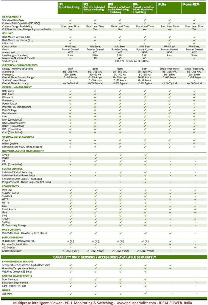 La tabella comparativa include tutte le caratteristiche delle PDU intelligenti delle serie IP REM, IP LITE, IP1, IP2, IP3 e IP4, per orientarti al meglio nella scelta del prodotto.